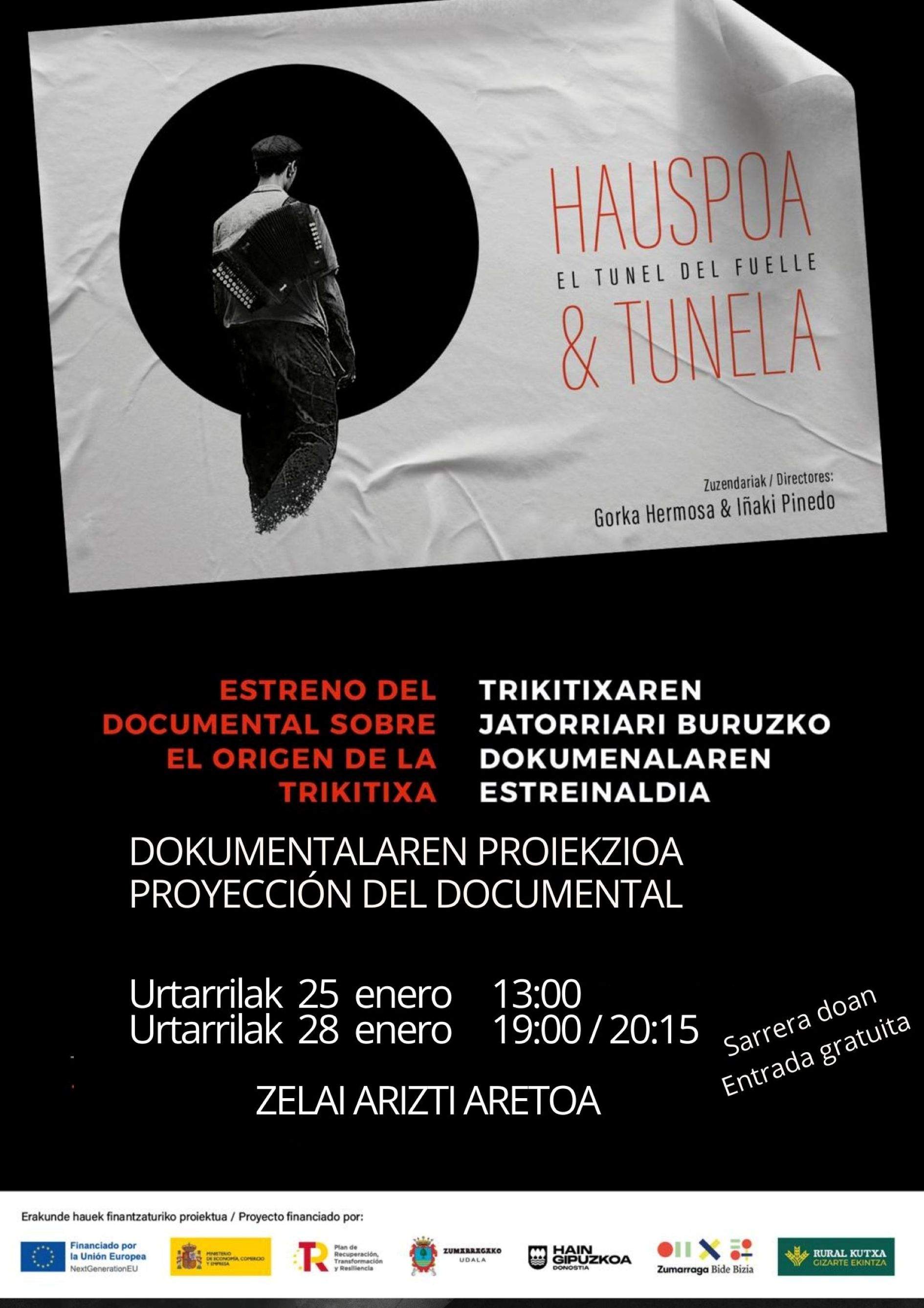 Cine 25 y 28 de enero Zelai Arizti aretoa 25 de enero, domingo: 13:0028 de enero, miércoles: 19:00 / 20:15Ficha artísticaFicha artísticaEl túnel del fuelle Proyección del documental dirigido por Gorka Hermosa e Iñaki Pinedo